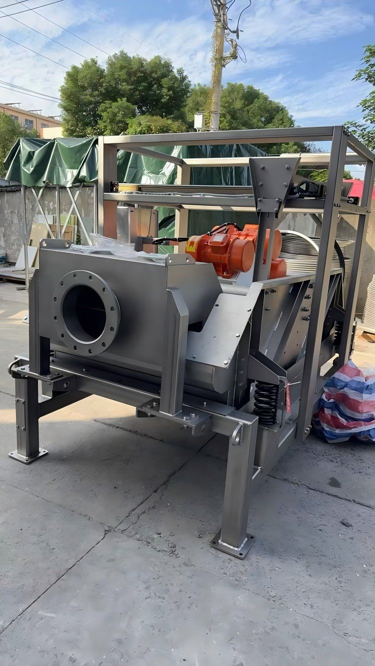 梁上的振動電機驅動, 振動被傳遞到篩板上,需要篩分的物料通過插入振動篩的管道釋放到篩板上,篩板 的振動使較小粒